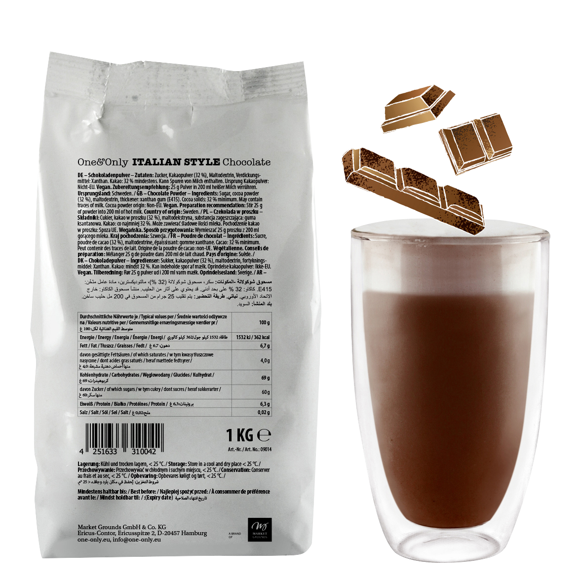 For all chocoholics! I am your One&Only Thick Drinking Chocolate - Italian Style! My high-grade chocolate powder Italian style with 32 % cocoa is produced from exquisite cocoa beans, resulting in a yummy chocolaty drinking chocolate. Just the ticket for chocolate connoisseurs and easy to make with hot milk. Whether with espresso, cream, sauces, syrups or Toppings – you can give me all your favourite flavours.